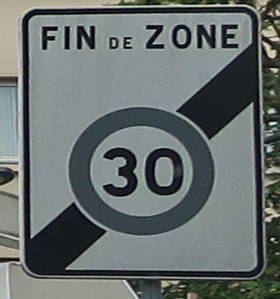 Un panneau de fin de zone 30 indique aux usagers qu'ils quittent une zone 30 et que la réglementation spécifique à cette zone ne s'applique plus.