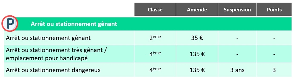 L'arrêt ou le stationnement très gênant ou sur un emplacement pour handicapé est puni par une amende de 135 euros.
